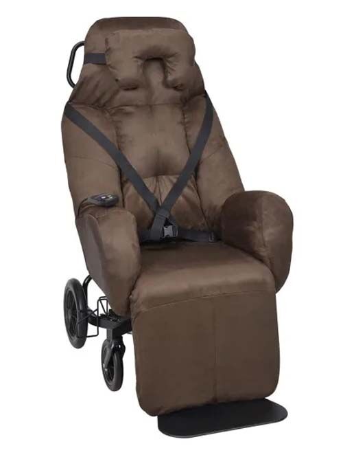 De série, il est équipé d’une assise à mémoire de forme en mousse Visco (Classe II), d’un harnais, et d’un oreiller cervical anatomique.